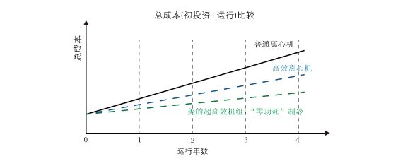 美的超高效双级压缩降膜式离心机组具有超高能效,COP高达7.11W/W,再加 上先进的“零功耗”制冷技术,在过渡季节能为需要供冷的场合免费制冷,每年 能为用户节约大量的运行成本。