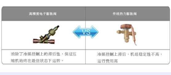 机组选用名优电子膨胀阀作为冷媒精细控制的零部件,大大提高机组的节能性和稳定性,降低运行费用。